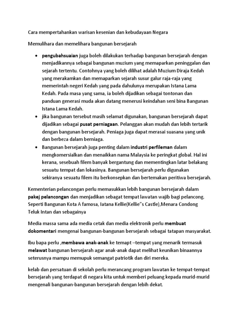Langkah perdana bagi memelihara dan memulihara warisan sejarah adalah dengan menjadikan mata pelajaran sejarah sebagai mata pelajaran yang wajib bagi setiap pelajar. Rakyat kita tidak kira keturunan agama dan amalan adat resam turut merayakan bersama-sama. Kepentingan Memelihara Dan Memulihara Seni Bina Islam Di Malaysia.