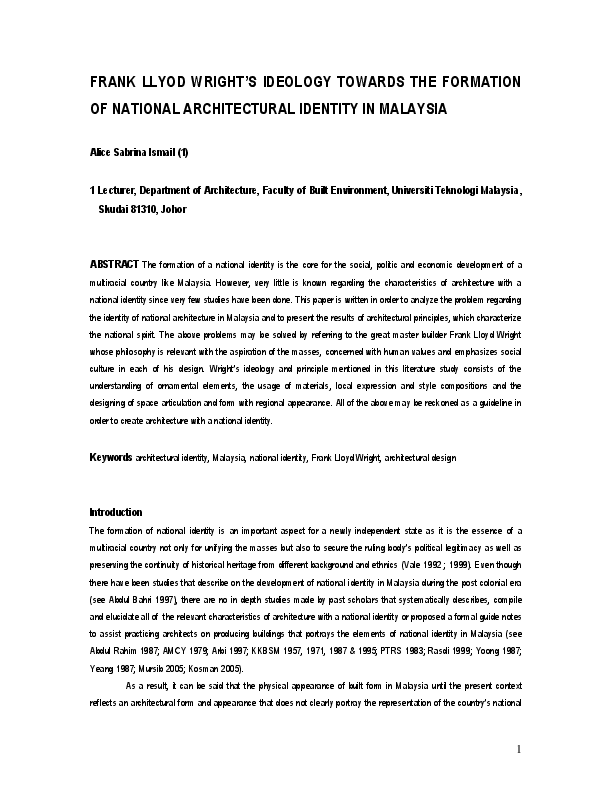Pdf Frank Llyod Wright Ideology Formation Of National Identity Alice Sabrina Ismail Academia Edu