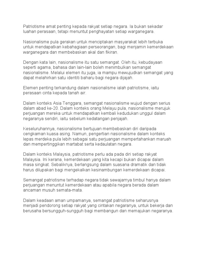 Pada akhir abad ke 18 di Eropa mulai berlaku suatu paham bahwa setiap bangsa harus membentuk suatu Negara sendiri dan bahwa Negara itu harus meliputi seluruh bangsa. Cara Memupuk Semangat Patriotisme Dalam Kalangan Masyarakat. Semangat patriotik merupakan antara ciri penting yang perlu dipupuk dalam kalangan segenap lapisan masyarakat dalam proses pembangunan dan halatuju negara bangsa kata Datuk Seri Najib Tun Razak.